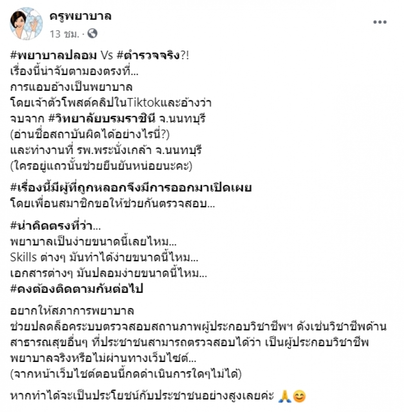 ขณะเดียวกัน เพจ ครูพยาบาล ได้โพสต์คลิป ข้อกฎหมายหากพบบุคคลใดแอบอ้างปลอมตัวเป็นพยาบาล จะมีความผิดตามข้อกฎหมายอย่างไรบ้าง